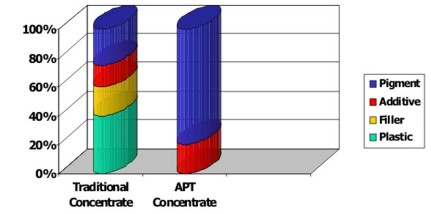 The APT Enhancer technology not only provides very measurable process improvements, it also has the capability of acting as a very efficient carrier of other additives. APT has developed an additive delivery system called MFP ® (Multi-Functional Pellet), which has the capability of providing additives such as UV, fire retardant, color, etc. together, all in one pellet, such that the concentration of additive is the highest in the industry.